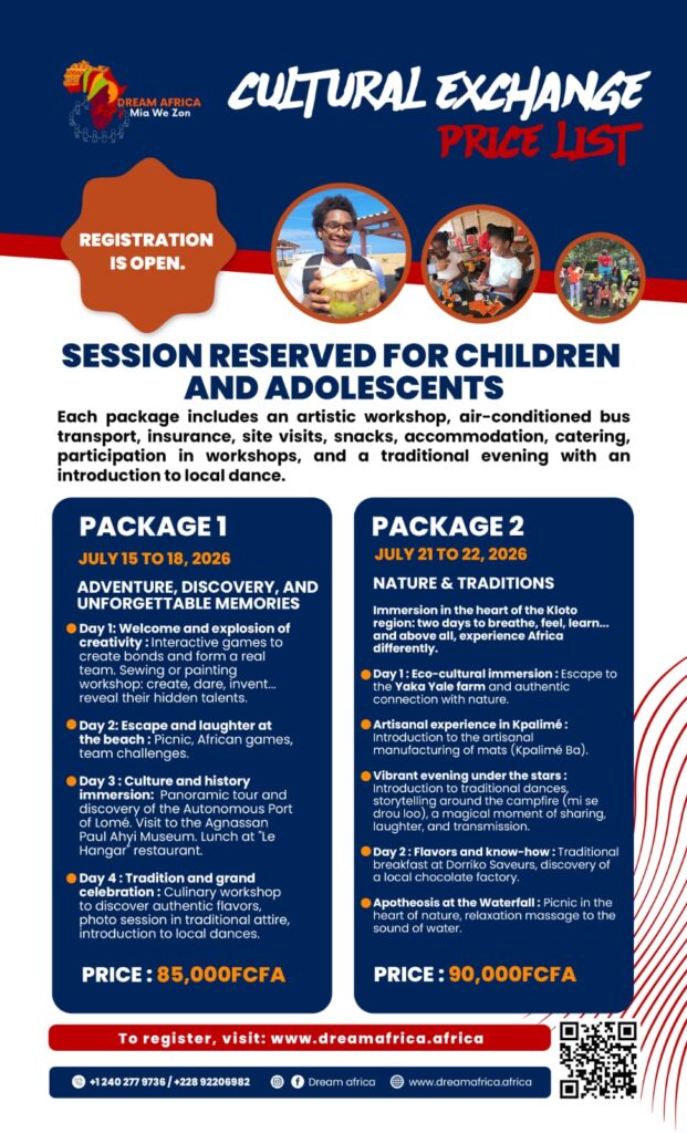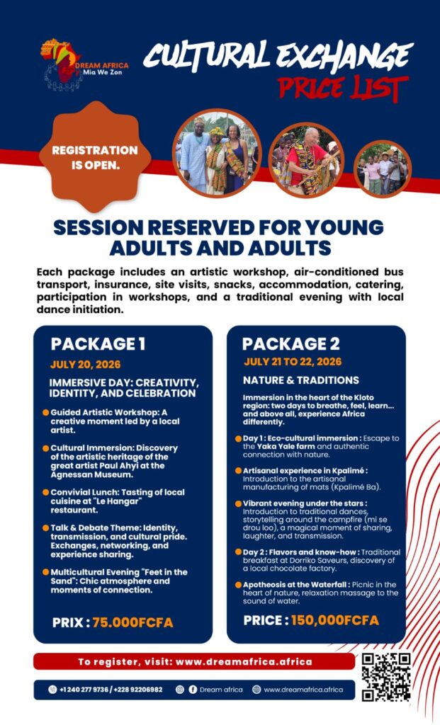 - Each package includes a batik workshop with personalization of the Dream Africa T-shirt, air-conditioned bus transportation, insurance, site visits, snacks, accommodation, meals, participation in workshops, and a traditional party with initiation to local dance.